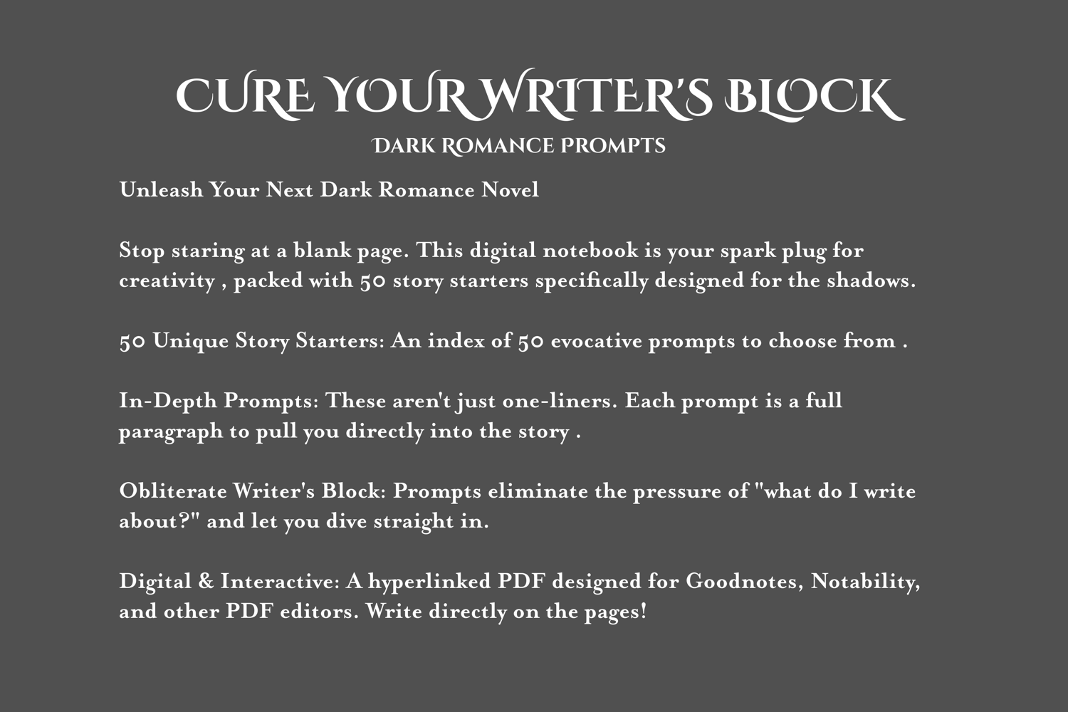 Stop staring at a blank page. This digital notebook is your spark plug for creativity, packed with 50 story starters specifically designed for the shadows. This is an instant download, fully hyperlinked PDF designed to be used in Goodnotes, Notability, or any PDF annotation app.
