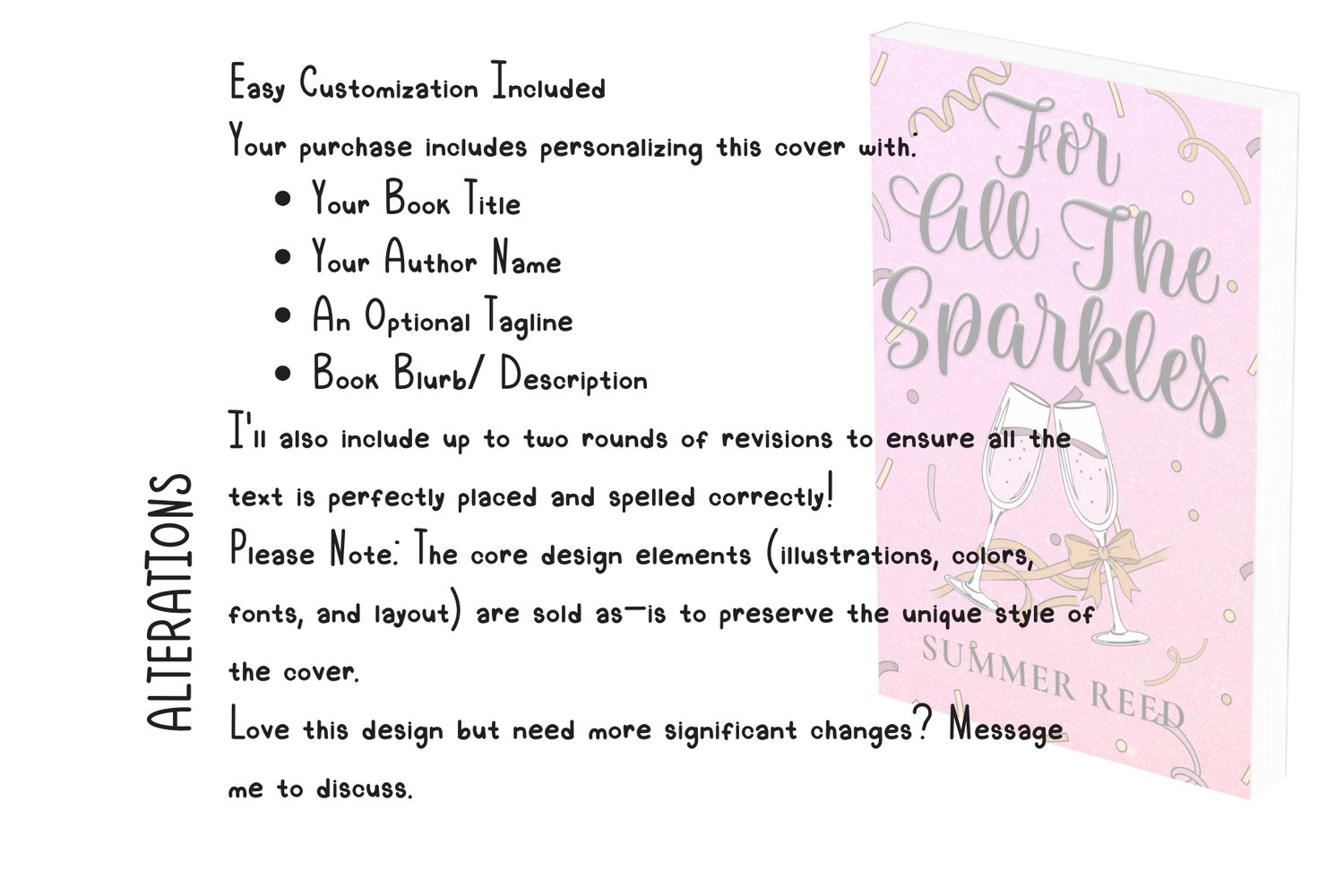 - Text-Only Edits: The included personalization covers all your text needs—title, name, blurb, and tagline.